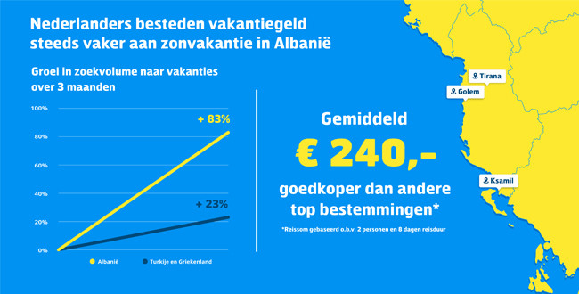 Albanië was tot enkele jaren geleden nog een relatief onbekende zonbestemming, maar is inmiddels duidelijk in opmars. De populariteit groeit structureel: het zoekvolume ligt inmiddels zelfs hoger dan dat van bekende zonbestemmingen zoals Turkije, Egypte, Griekenland en Spanje.